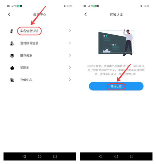 第十三步、实名认证:点击首页右下角“会员”,再点击“会员中心”,点击“实名信息认证”,点击“开始认证”,如下图: