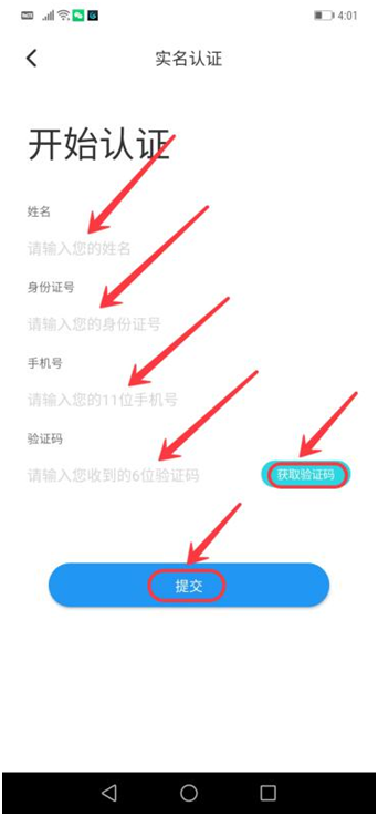 第十四步、开始认证:分别填入:姓名、身份证号、手机号,获取验证码,点击“提交”即可,如下图: