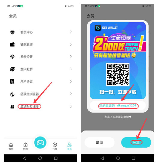 第十五步、邀请好友注册:点击首页右下角“会员”,点击“邀请好友注册”,弹出邀请二维码,点击复制“您的邀请码”,然后点击“分享”,将邀请二维码转发微信好友。注意:分享二维码后,同时将复制的邀请码同时发给对方,如下图:
